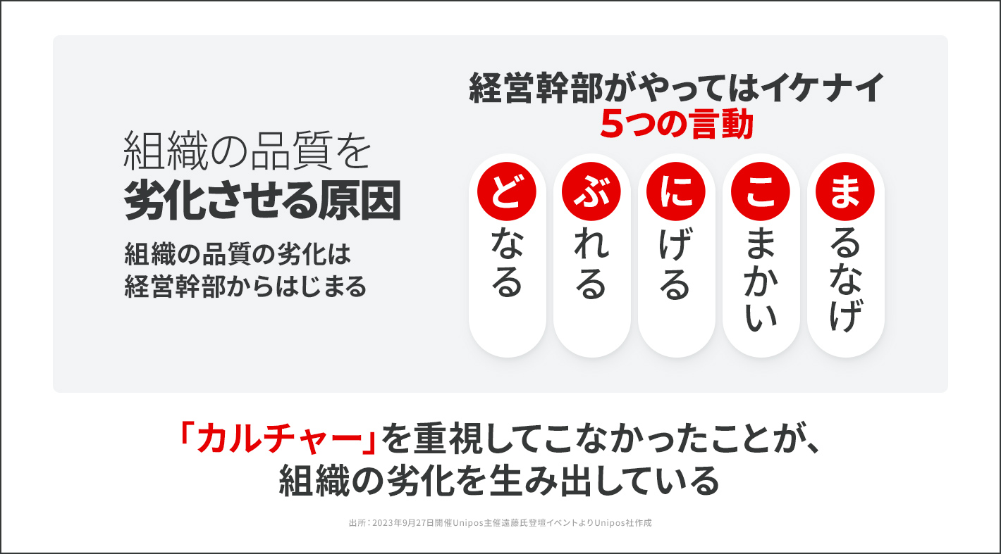 「まず、『どなる』のはパワハラですよね。意志薄弱で言動が『ぶれる』、自分で決めずに『にげる』、部下に任せず指示が『こまかい』、責任放棄して『まるなげ』する。こういった5つの言動をする人が上にいると、当然のことながら組織風土は悪くなります。このことを経営幹部はしっかりと認識する必要があります」(遠藤氏)