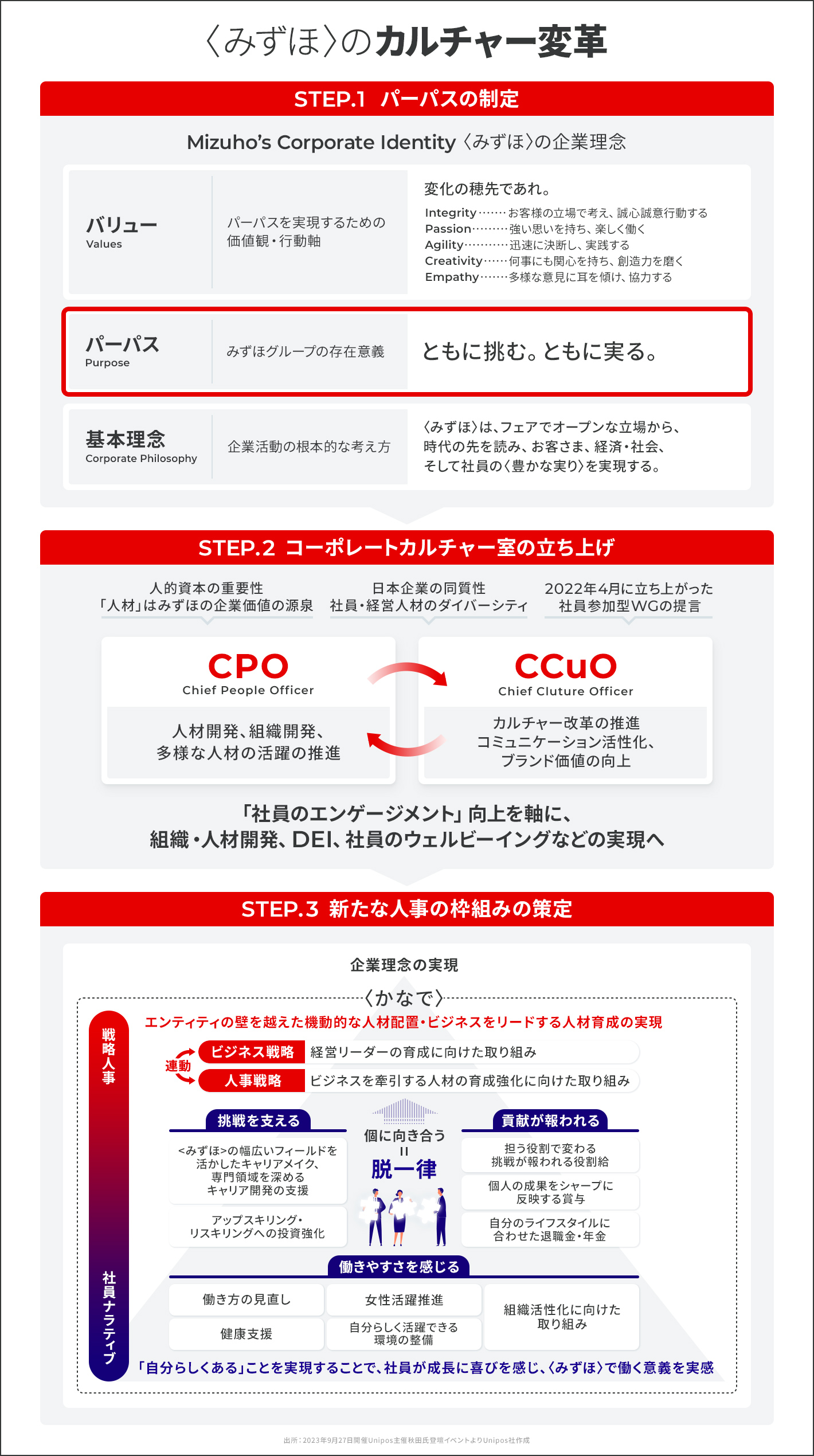 同社では2023年5月に企業理念を再定義し、パーパスを制定した。きっかけは、〈みずほ〉を良い会社に変えたいという想いを持ったメンバー150名が自主的に立ち上げたワーキンググループだった。「経営理念を再定義したほうがいいのでは」という声がメンバーから上がり、約半年にわたって経営陣に対して素案をぶつけ、議論を重ねそれを全社員に公開。それに対して社員がフィードバックするのを繰り返し、「ともに挑む。ともに実る。」というパーパスを制定した。