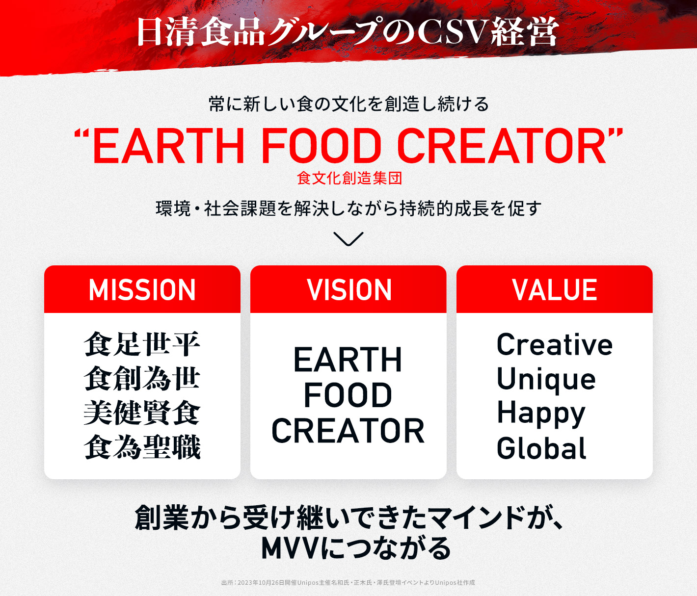 「私たちがなんのためにビジネスをやっているのかというと、『食足世平(食足りて世は平らか)』を実現するためです。『EARTH FOOD CREATOR』の実現という点では、1958年にチキンラーメン、1971年にカップヌードルと今まで皆さんが見たことがない魔法のようなラーメンを世に送り出し、宇宙ラーメンなどの開発にも取り組みました。そして、 VALUE(価値観)となるのが、Creative、Unique、Happy、Globalといった判断軸です。