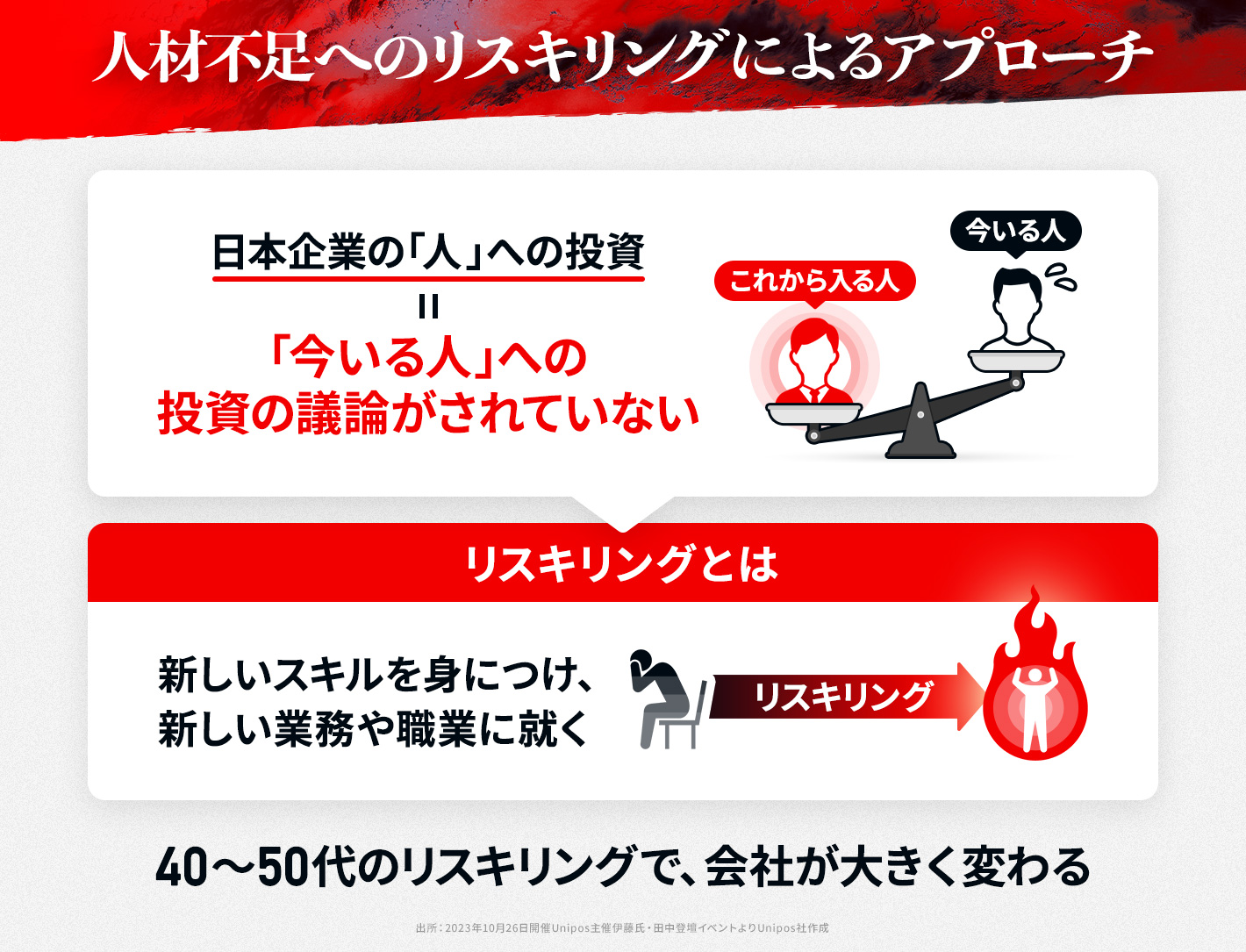 「人材を『これから入る人』『今いる人』に分けると、『これから入る人』に対しては多くの企業で積極に採用活動を行い、頑張っていると思います。しかし、『今いる人』に対してはもっとドラスティックな投資が必要だと思いますが、議論がぽっかり抜けているように感じます」(田中)