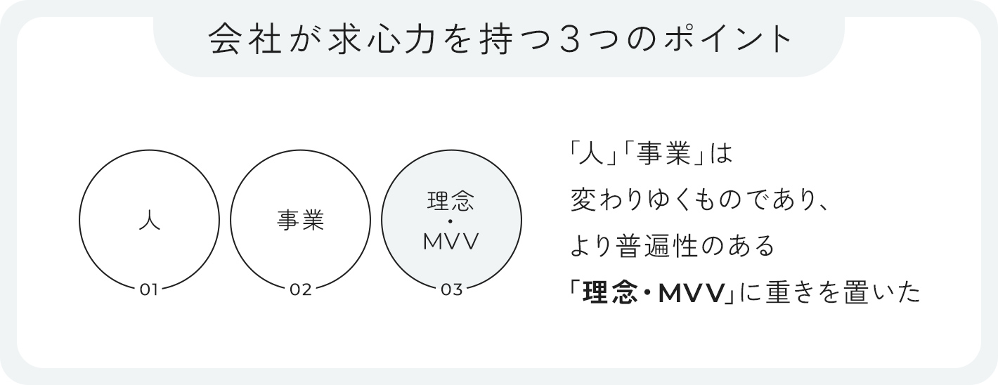 そして3つ目は「理念やMVV(ミッション・ビジョン・バリュー)」。この会社で、このメンバーとともに、この目標を達成したいという強い意志が組織を支えます。