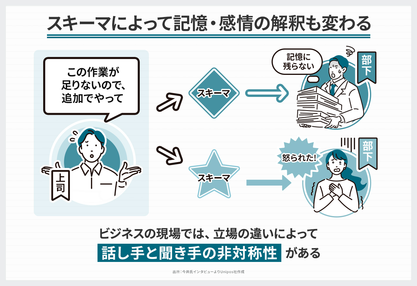 スキーマは立場によっても異なるので、上司にとっては最重要事項で何度も繰り返し説明しても、部下は大事だと捉えられずに忘れてしまうこともあるでしょう。これは上司の言い方に原因があるというよりは、「スキーマの違い」がミスコミュニケーションにつながっていると言えます。