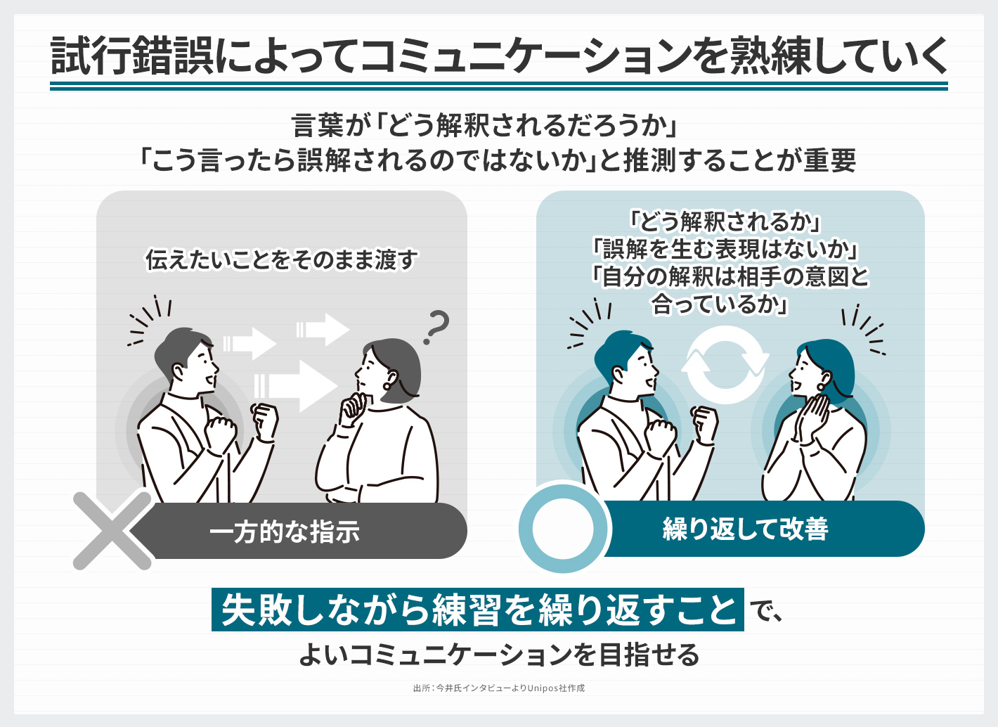 常に「自分の解釈は、本当に相手の言いたいことなんだろうか?」と疑うこと。そして、「自分の話を相手がどう解釈するだろうか?」と推論すること。この繰り返しによって、熟練していくしかありません。