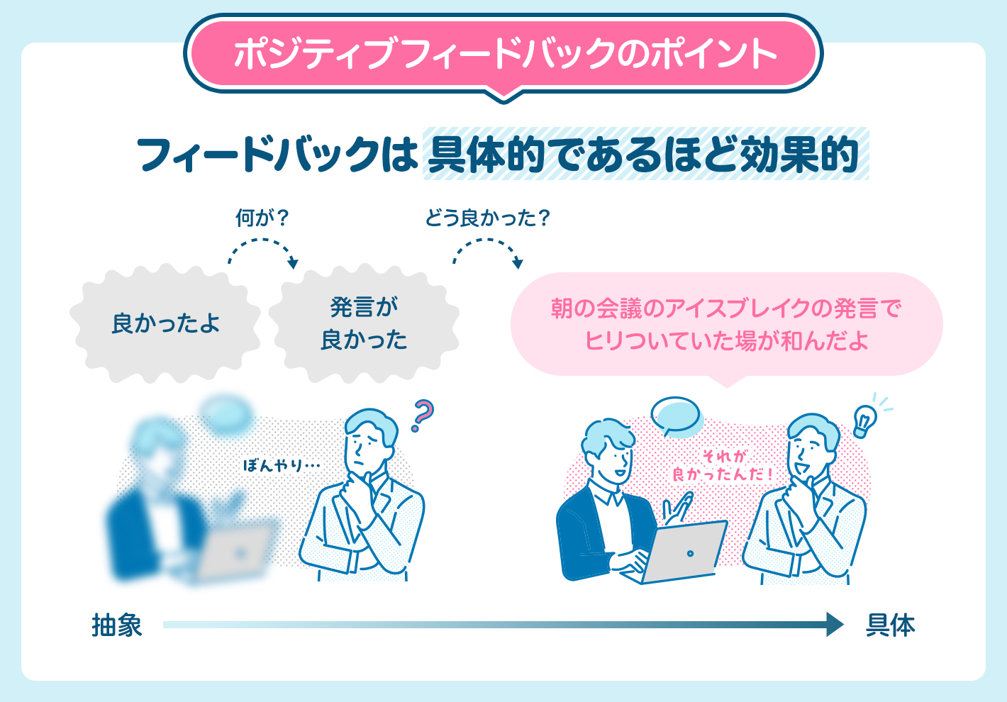 2つ目は、「具体性」です。上司から「良かったね」と褒められても、「本音で言ってくれているのかな?」と疑ってしまう部下もいます。「昨日の会議は参加者が多くてピリピリした雰囲気だったけれど、あなたのアイスブレイクで会場が和んだね」など、上司ができるだけ具体的な状況を挙げて伝えれば、部下は自分のどこが良かったのかを理解することができます。