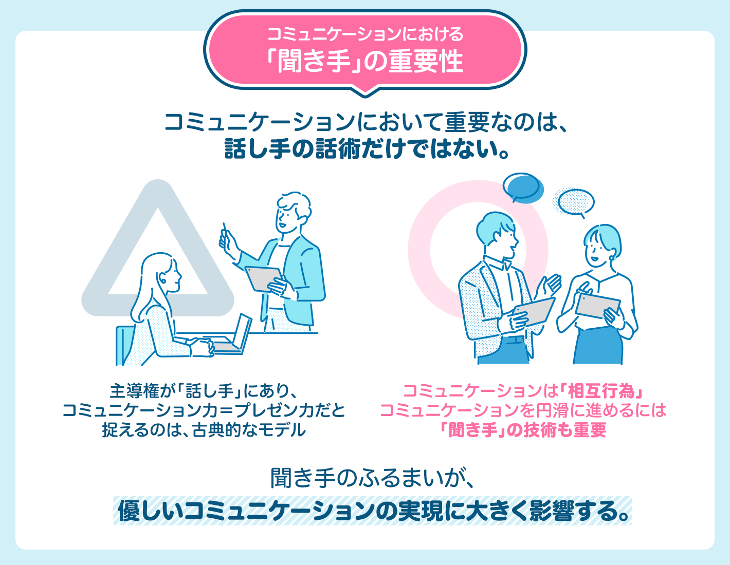 でも、それは昭和によく見られた話し手中心の古典的モデルだといえるでしょう。ビジネスにおいては、長らく「情報をどう伝えるか」が重視されてきた背景がありますが、コミュニケーションとは本来、一方通行のものではありません。