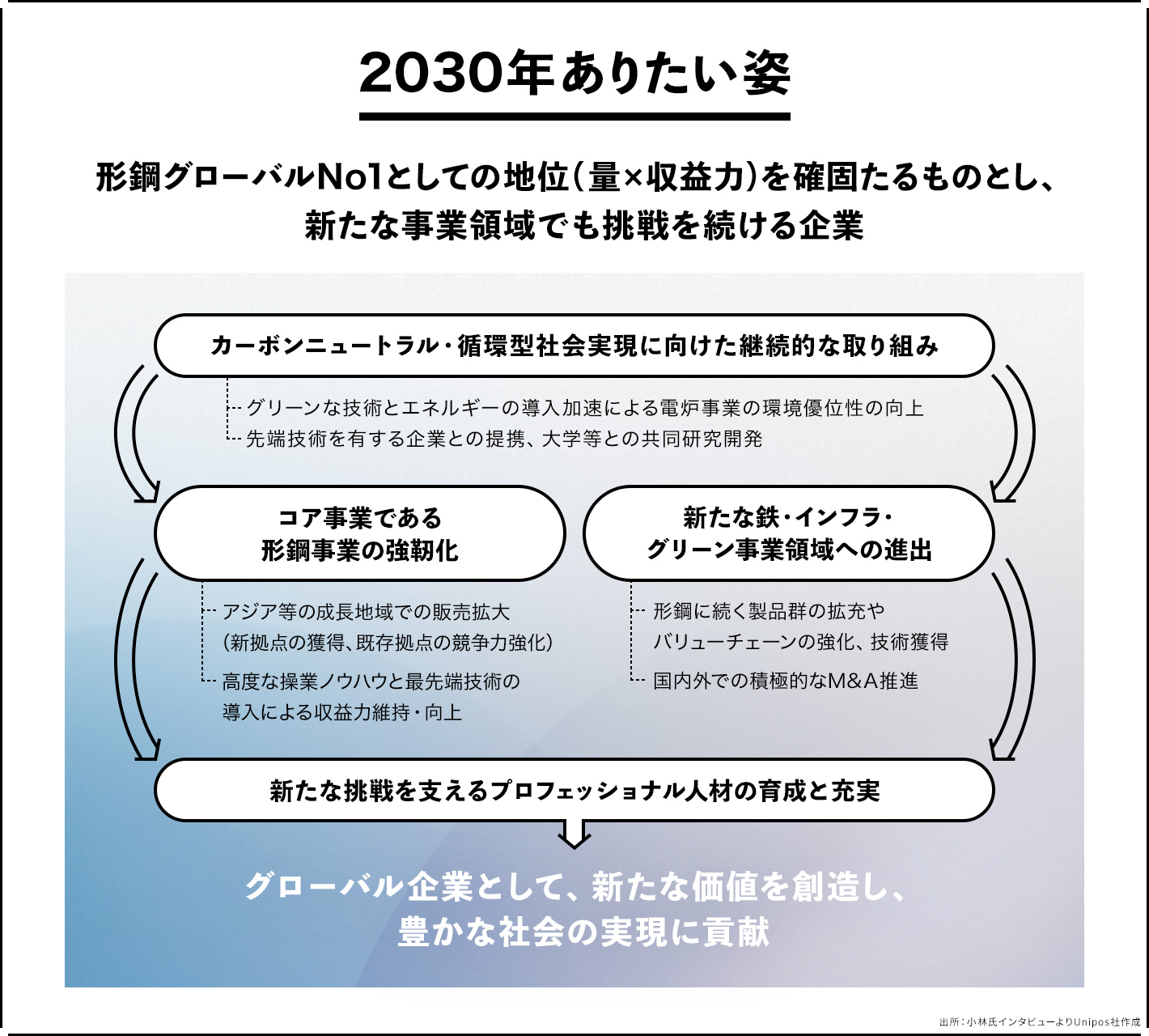 当社は電炉業界の中でも1980年代後半という早い段階でグローバル展開を決断しましたが、そのグローバル展開を成功させてきた原動力は、創業以来受け継がれてきた「フェア(公正)」と「挑戦」の精神でした。どれだけ時代や社員の価値観が変わっても、社員一人ひとりが「フェア」に、そして積極的に「挑戦」できる会社・組織であり続けたいと思っています。組織づくりにおいても、この精神を大切にしながら、進化を続けていきます。