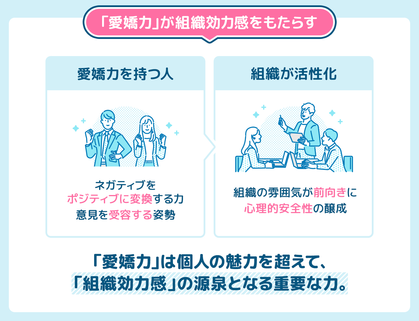 また、「愛嬌力」を持つ人は、自分の意見を率直に伝えつつ、相手の意見も否定せずに受け入れる「受容する姿勢」を持っています。この姿勢がチームの一人ひとりに浸透すれば、お互いが安心して発言できる心理的安全性の高い状態がつくられ、建設的な議論が活発になります。