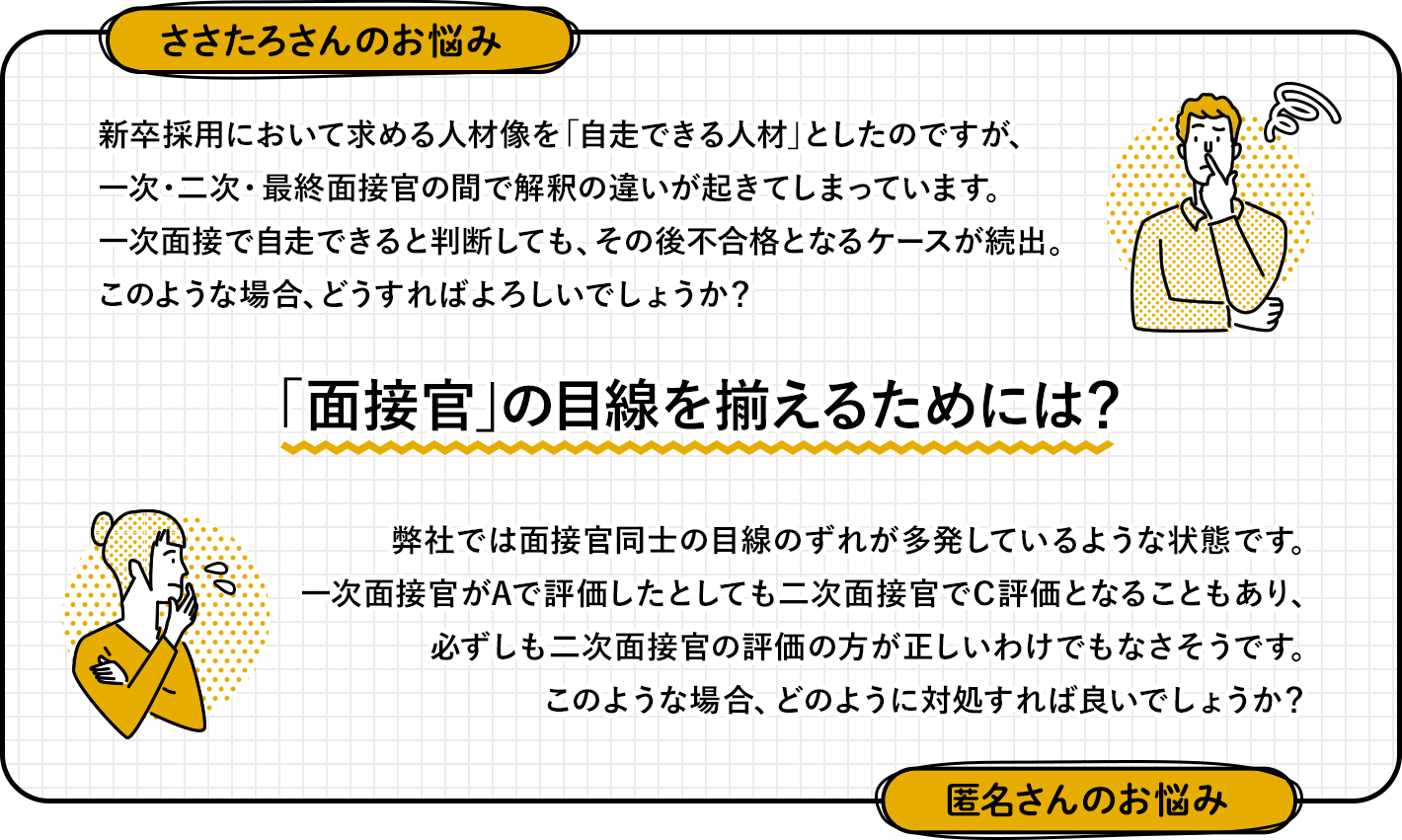 まず、ささたろさんのケースですが、「自走できる人材」と定義したものの、おそらく面接官同士でその人物像や人材要件についての解釈が一致しておらず、そのような状態になっているかと推察します。また、匿名さんのケースも背景で同様のことが起きているのではないかと思います。