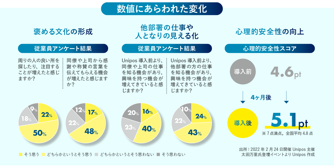 また、アンケート結果にも、「従業員同士でポジティブな言葉をかけあう、褒める文化が生まれた」「オープンなコミュニケーションを通じて、他部署の仕事や人となりの見える化が進んだ」といった変化があらわれた。