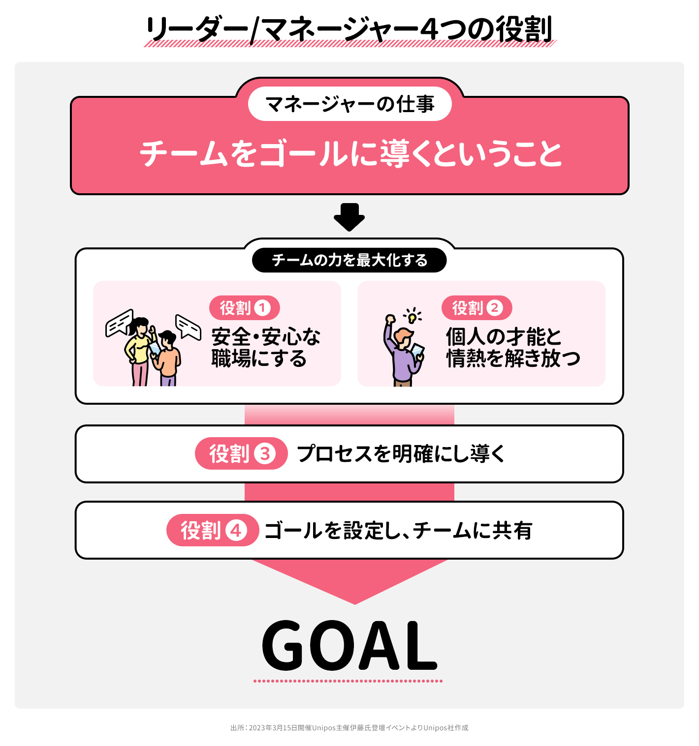 伊藤氏曰く、マネージャーは「あらかじめゴールを設定してから、それをチームに共有しなければいけない」。そして「その後ゴールまでのプロセスを明確にしながら、チームをゴールに導いていかなければいけない」。